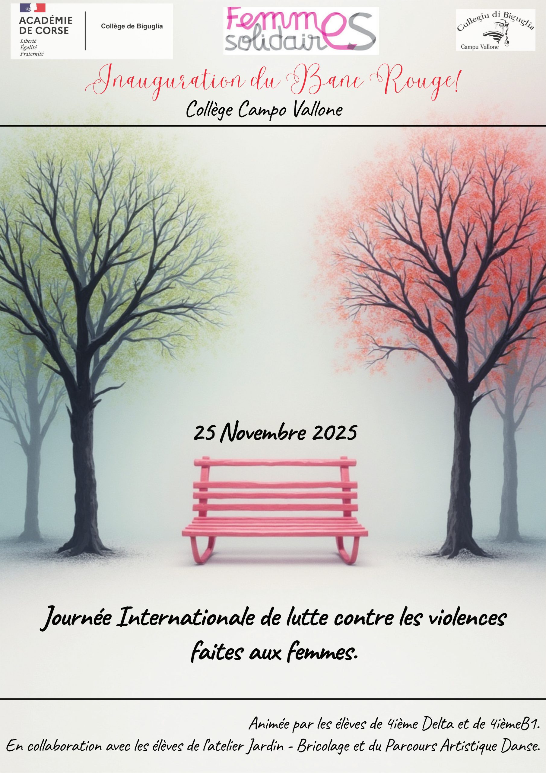 Le CollĂšge Campo Vallone de Biguglia cĂ©lĂšbre, le mardi 25 novembre 2025, la JournĂ©e internationale de lutte contre les violences faites aux femmes Ă travers lâinauguration dâun banc rouge, symbole fort de sensibilisation et dâengagement contre les violences faites aux femmes.