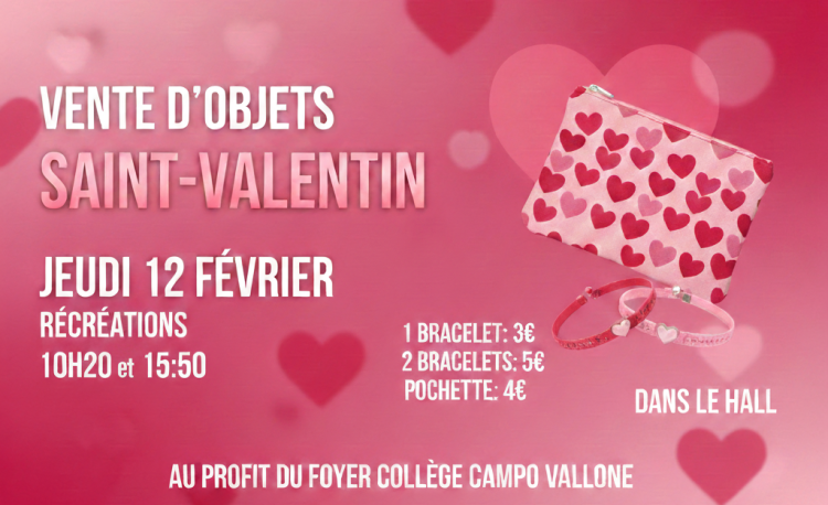 À l’occasion de la Saint-Valentin, une vente d’objets est organisée au sein du collège jeudi 12 février, dans le hall, durant les récréations de 10h20 et 15h50.